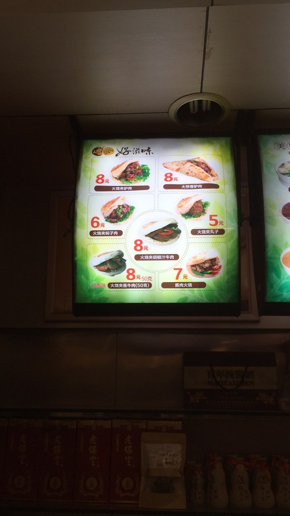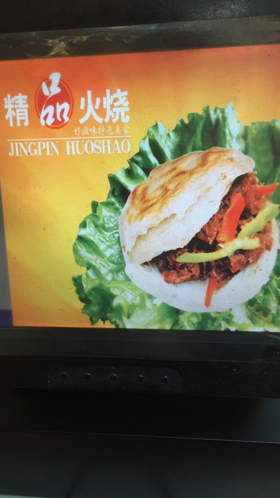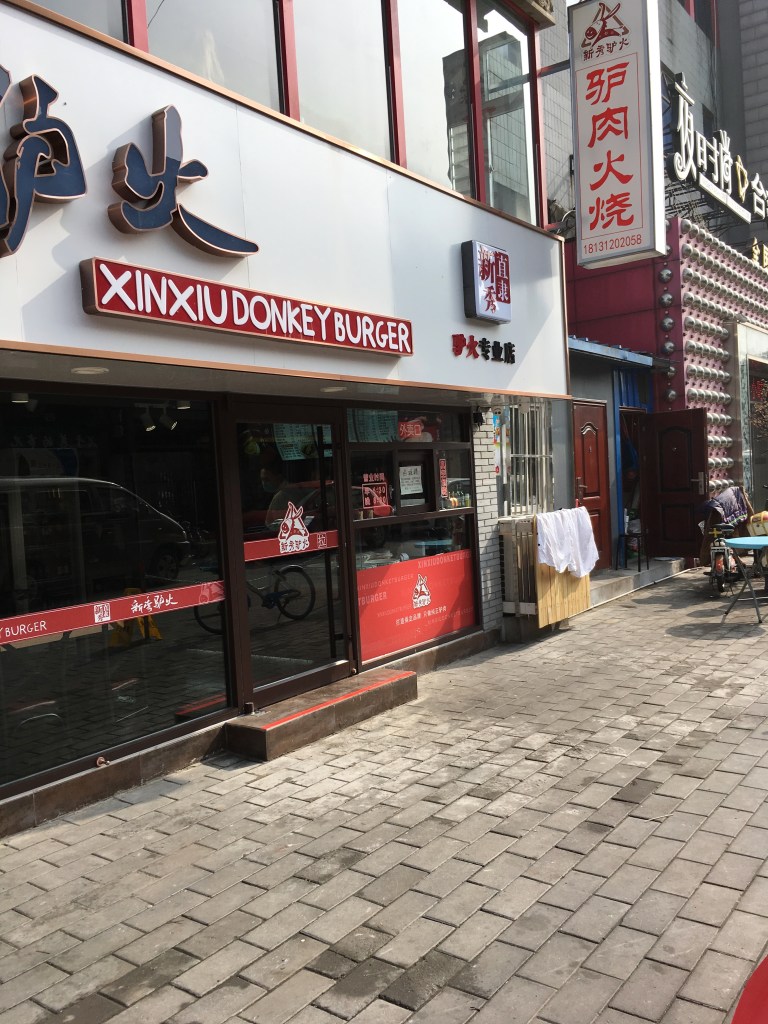 The most famous local speciality food is the “Chinese Sandwich” or “donkey burger” (驴肉火烧 lǘròu huǒshāo). This consists of hot chopped or shredded donkey meat or offal within a huǒshāo or shāobǐng 烧饼 – a roasted, semi-flaky bread pocket, a bit like pitta bread. A well-known saying, especially in Baoding (and elsewhere in Hebei province), is “In Heaven there is dragon meat, on Earth there is donkey meat” (天上龙肉,地上驴肉).