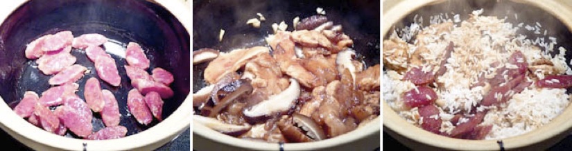 In a large clay pot, heat sesame oil. Fry lap cheong until lightly brown, about 2 minutes. Remove fried lap cheong, leaving the oil in the pot. Set aside.