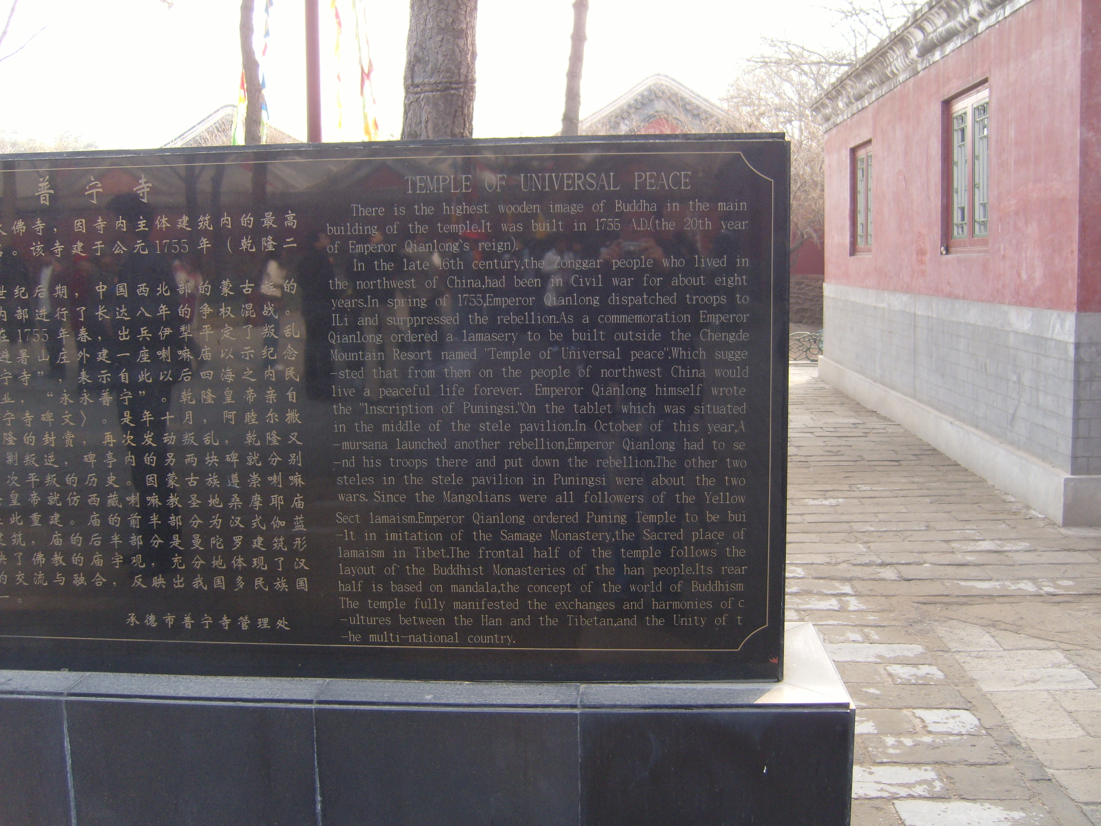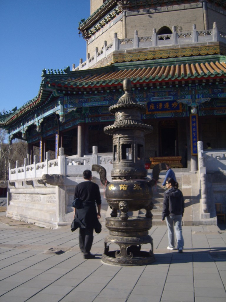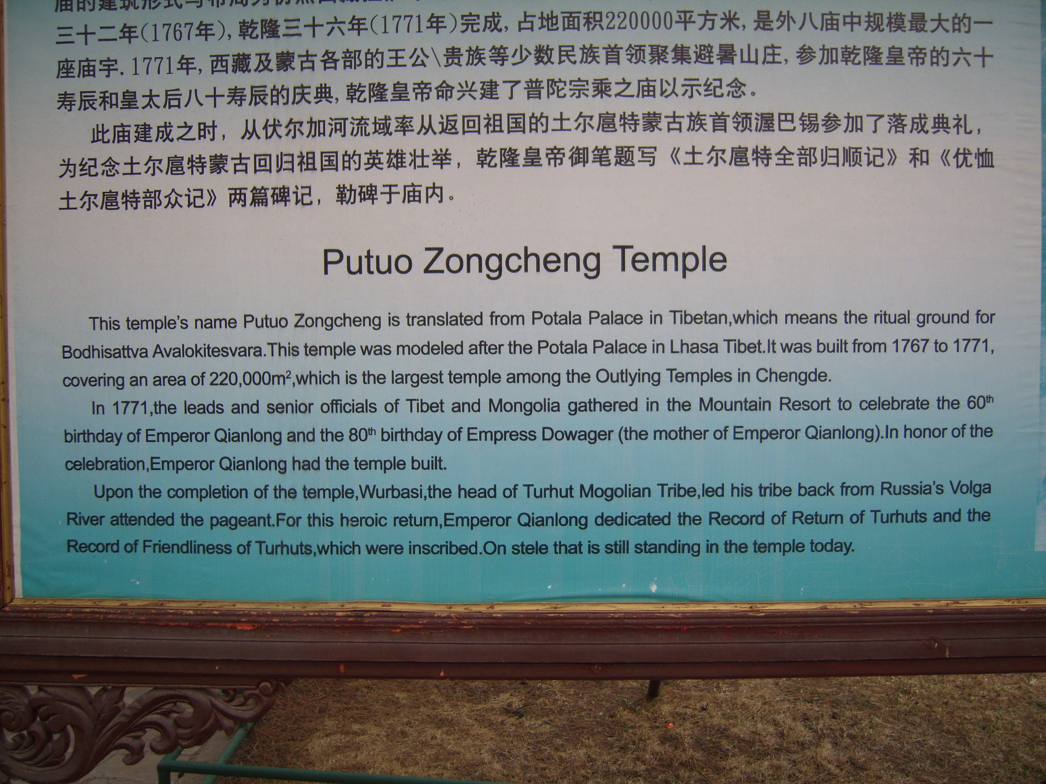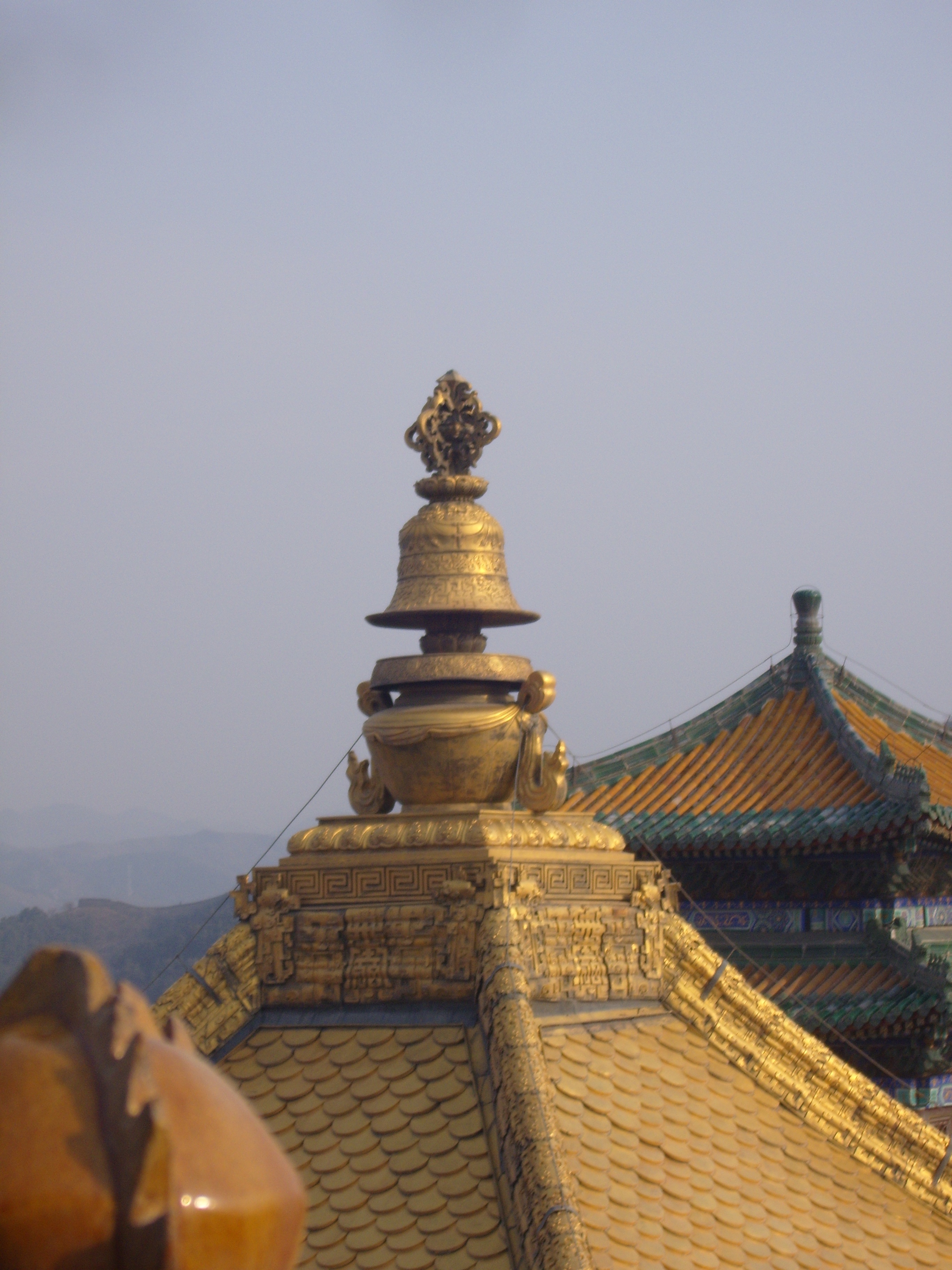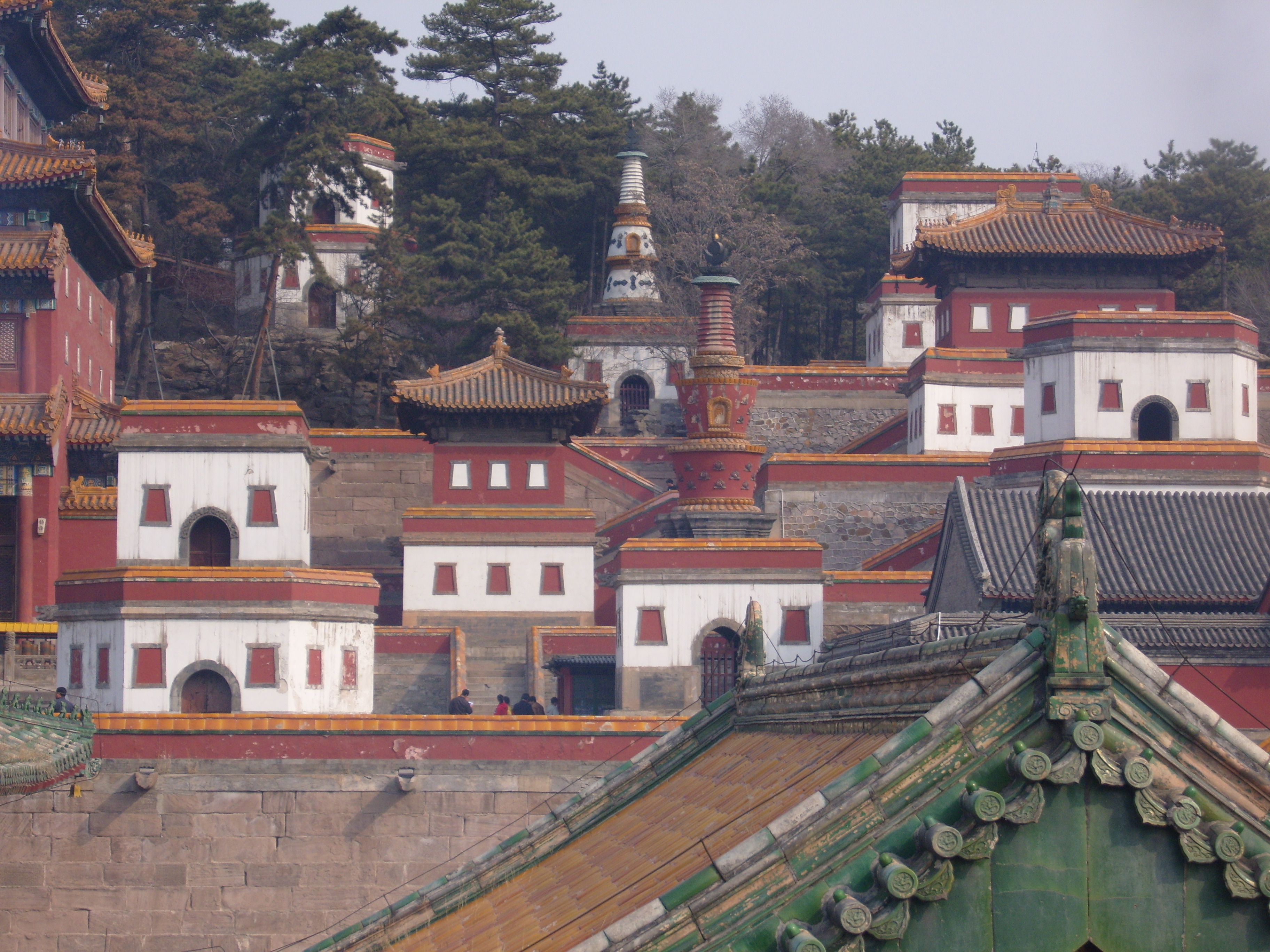 The afternoon meant the Putuo Zongcheng Temple, the biggest of the Eight Outer Temples, and one of the largest in China, which in turn was modeled after the Potala Palace of Tibet, the residence of the Dalai Lama built a century earlier. Many of its halls and pavilions have copper and gold tiled roofs.