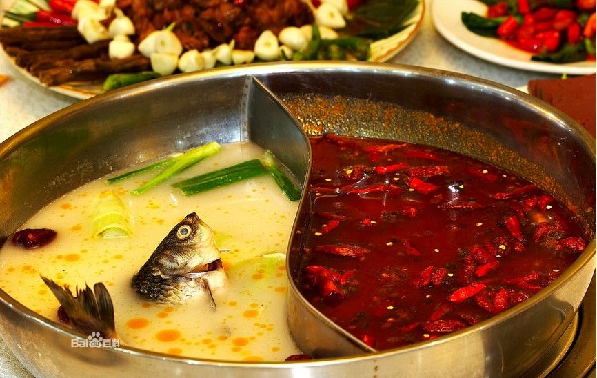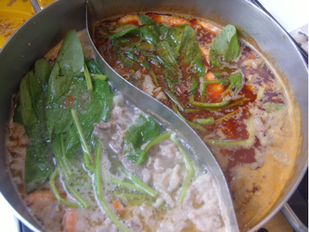 The “ying-yang” type of pot is quite common where traditional chafing-dishes are not used, because it allows both spicy and plain sauces to be used.