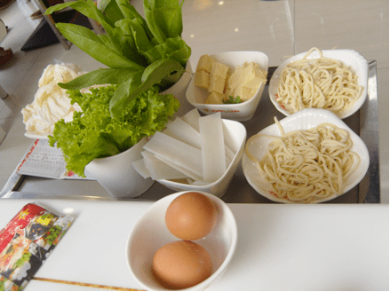 Once the sauce is boiling, each diner adds meat, vegetables and tofu for a few seconds (longer with root vegetables), fishes the cooked object out with chopsticks or a slotted spoon, dips it in their own bowl of the dip, and eats it. Noodles (clear vermicelli or thin egg-noodles) can go in when you’re near the end. Obviously, the sauce gets stronger and tastier as the meal progresses.