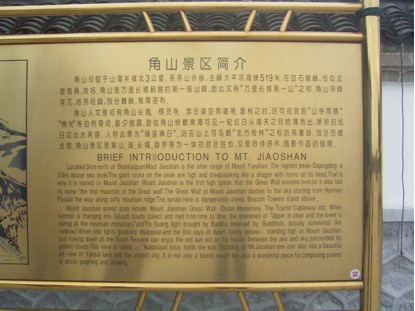 The Great Wall of China zigzags in northern China from Laolongtou (Old Dragon’s Head) by the Bohai Sea all the way to the desert in western China. Jiaoshan is the first mountain it climbs going in this direction, so it is known as the “First Mountain of the Great Wall”.