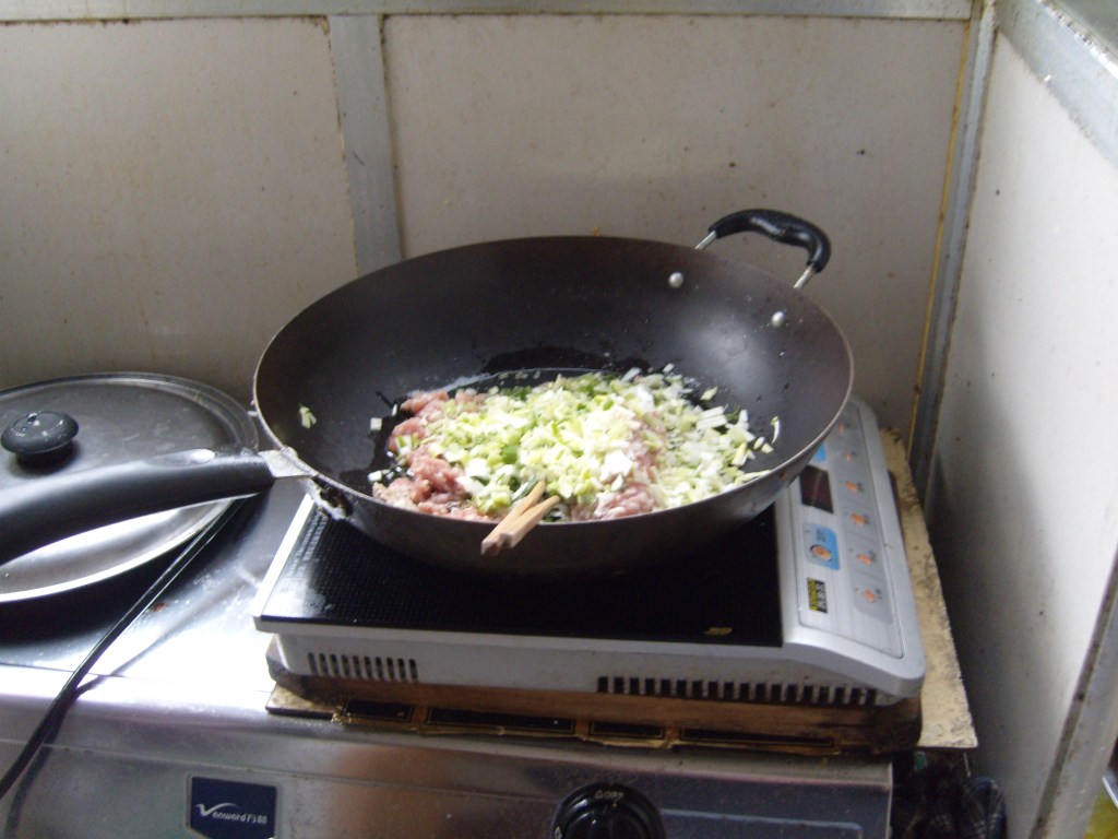 First chop the ingredients (vegetables and meat) finely, and add salt (actually quite necessary – without salt, they can be rather tasteless), some soy sauce, and any spices you may like.