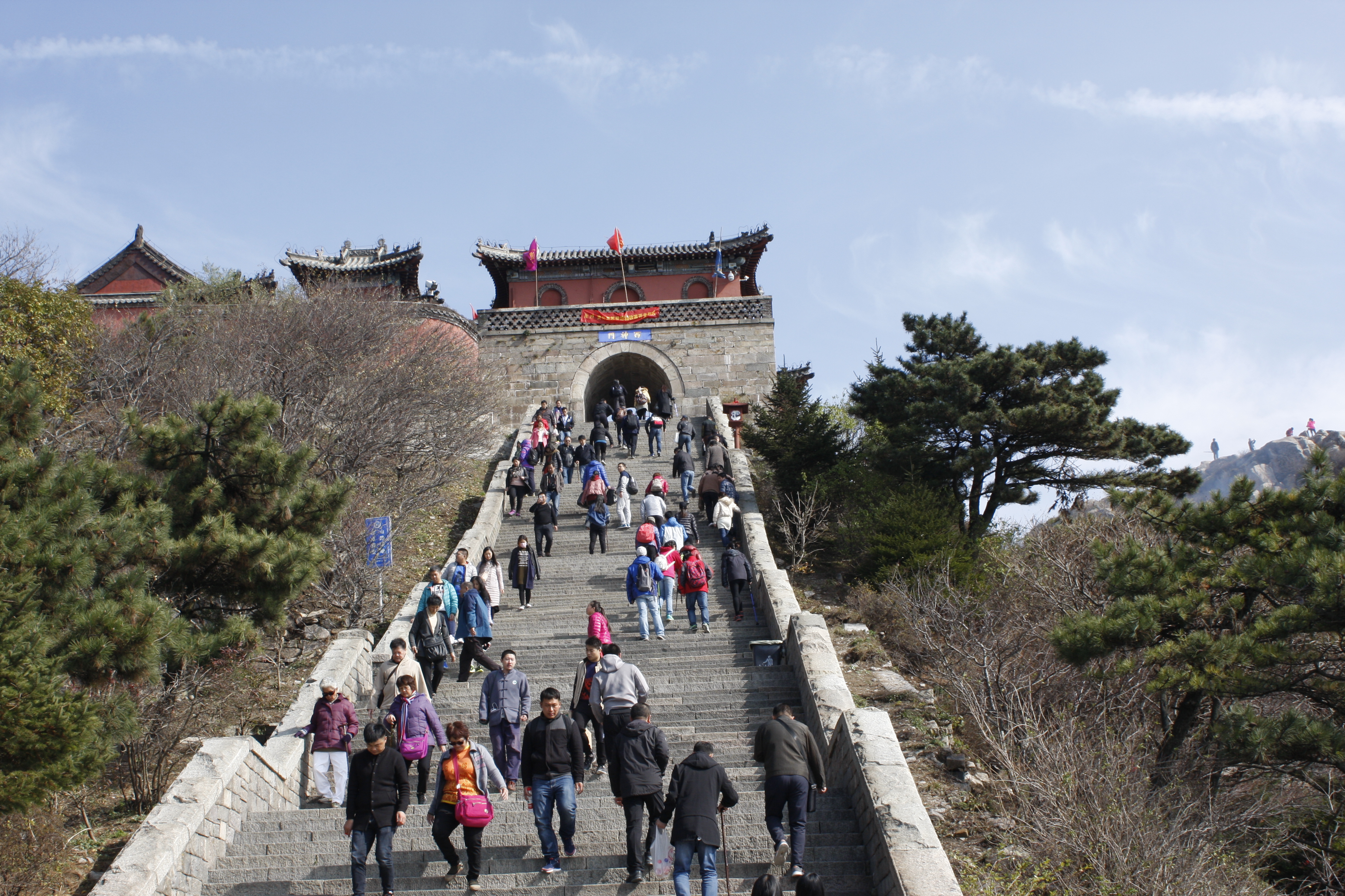 There is just one catch: according to Wikipedia, “A flight of 7,200 total steps (including inner temple steps), with 6,293 Official Mountain Walkway Steps, lead up the East Peak of Mount Tai, along its course, there are 11 gates, 14 archways, 14 kiosks, and four pavilions.