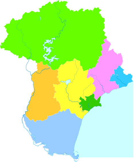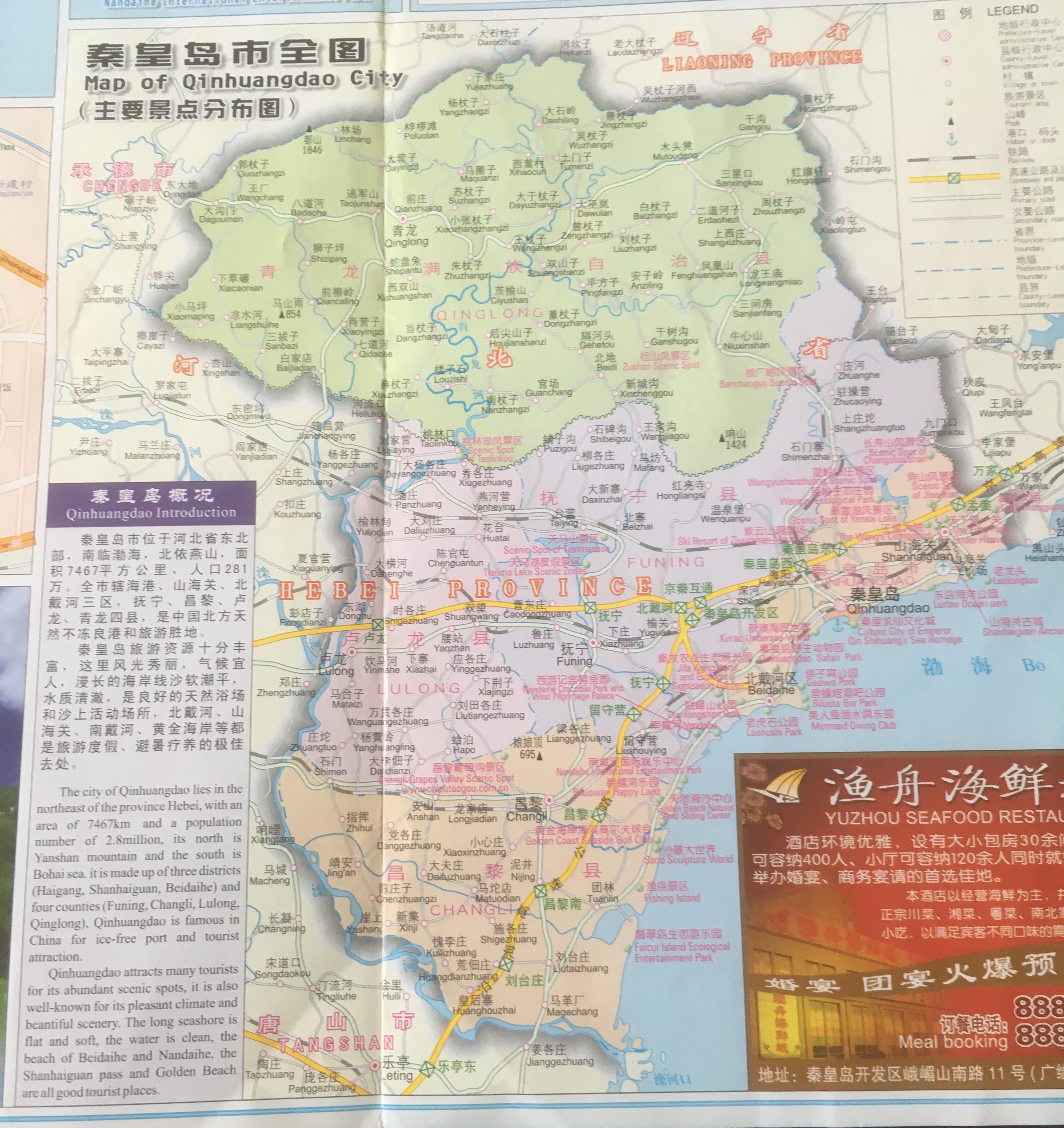 The city* of Qinhuangdao is made up of three urban districts – Shanhaiguan (blue), Haigang (lilac), and Beidaihe (dark green) – and 4 mostly rural counties – Qinglong Manchu Autonomous County (pale green), Lulong (brown), Funing (yellow), and Changli (pale blue). More detail on each of these is available via the links.