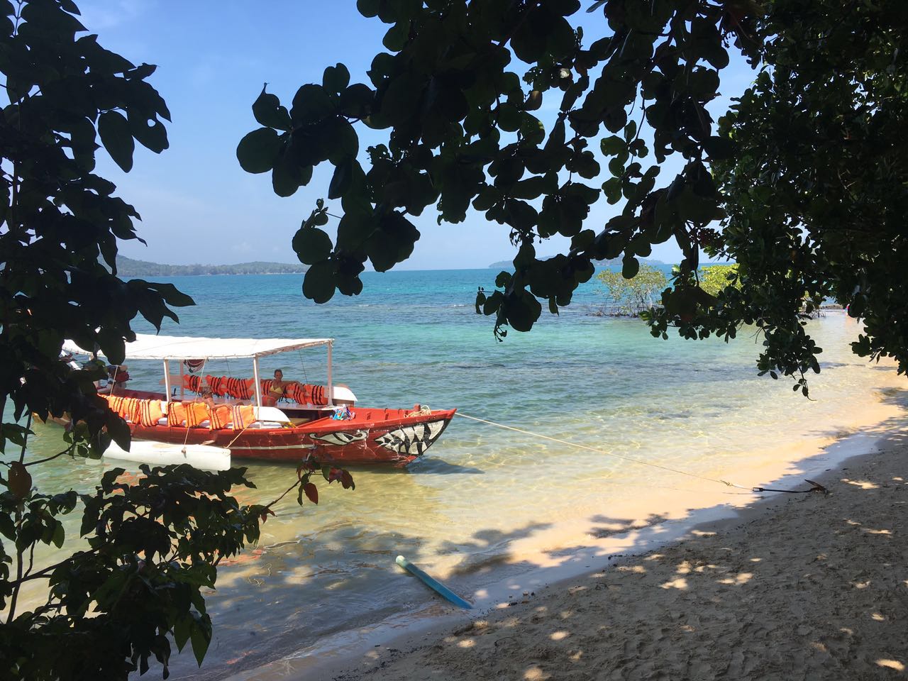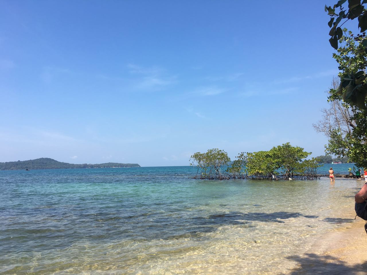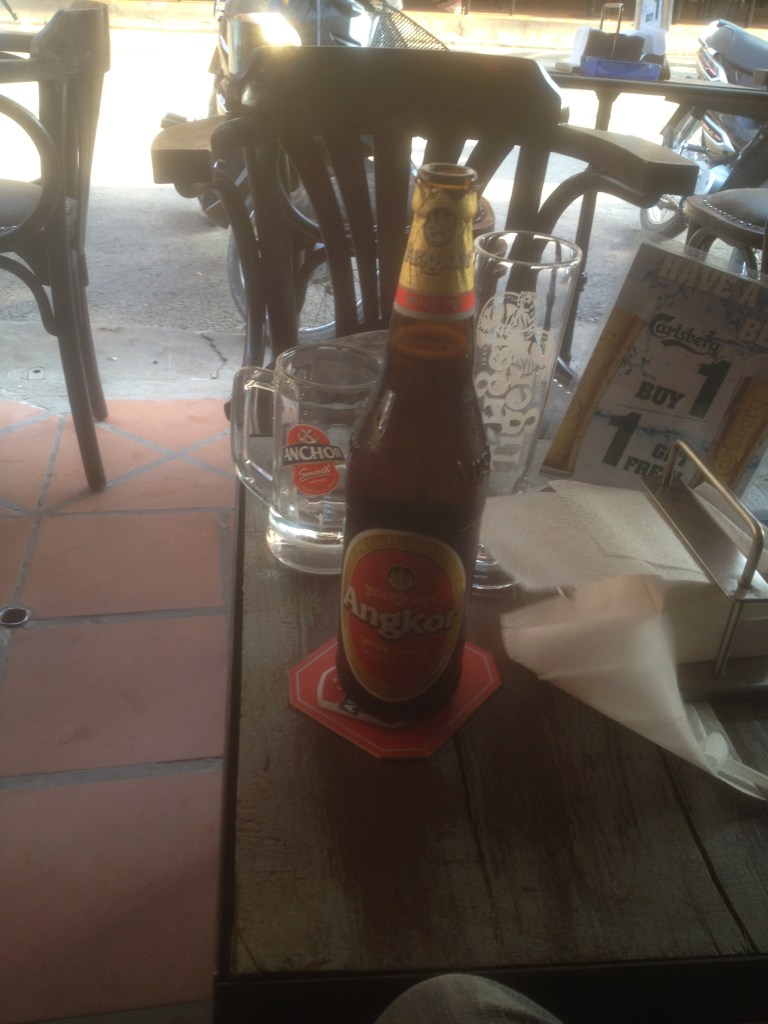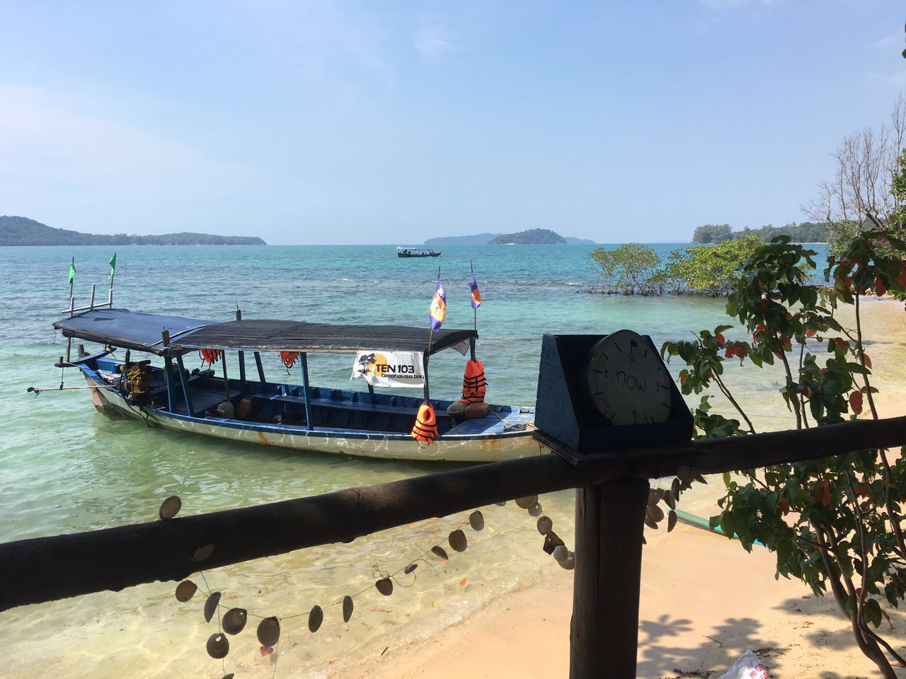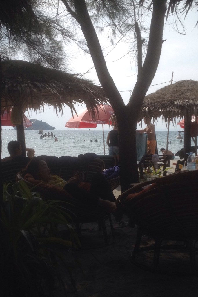 The boat trip was fairly interesting, with a couple of stops for people to go swimming. (On the way back, my American friend trod on a sea-anemone during a dive – he spent the next few days in severe pain, which didn’t put him in a very good mood for some reason.) The island where we stopped – for far too long, I thought – had a bar and tree-houses (for guests) on it, and some more normal rooms. They also sold marijuana at the bar, either loose or in ready-made joints, despite the fact that it has not been legal in Cambodia for some years. Most of the customers were French or American backpackers, living the sixties’ hippy dream.