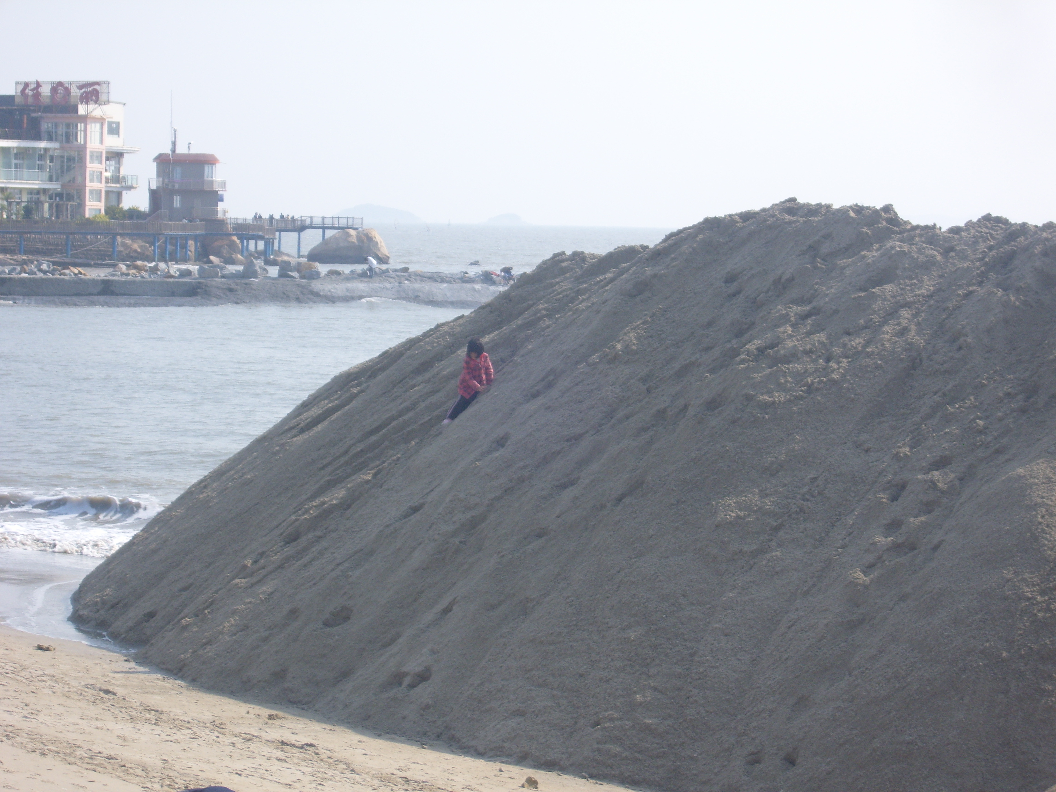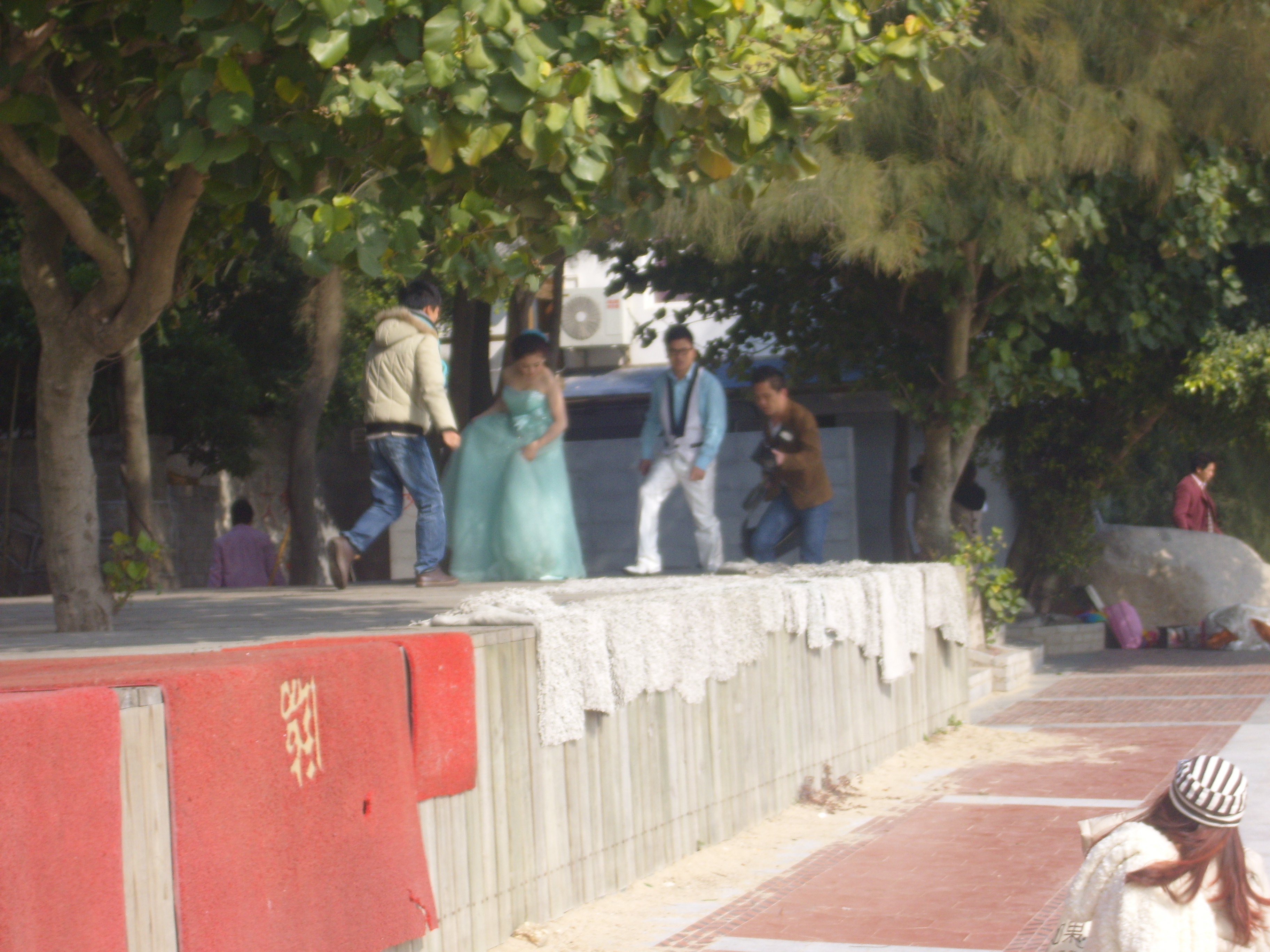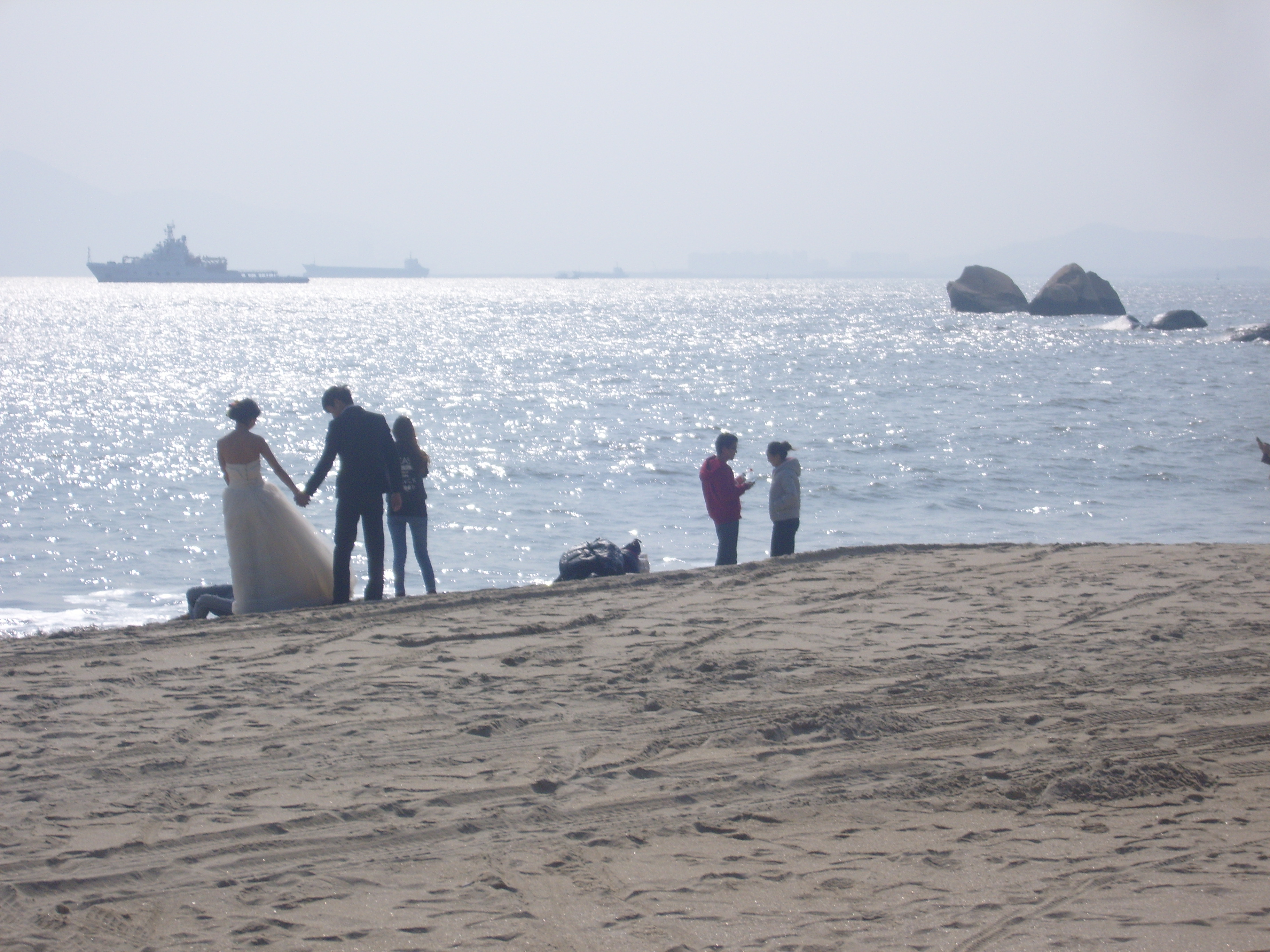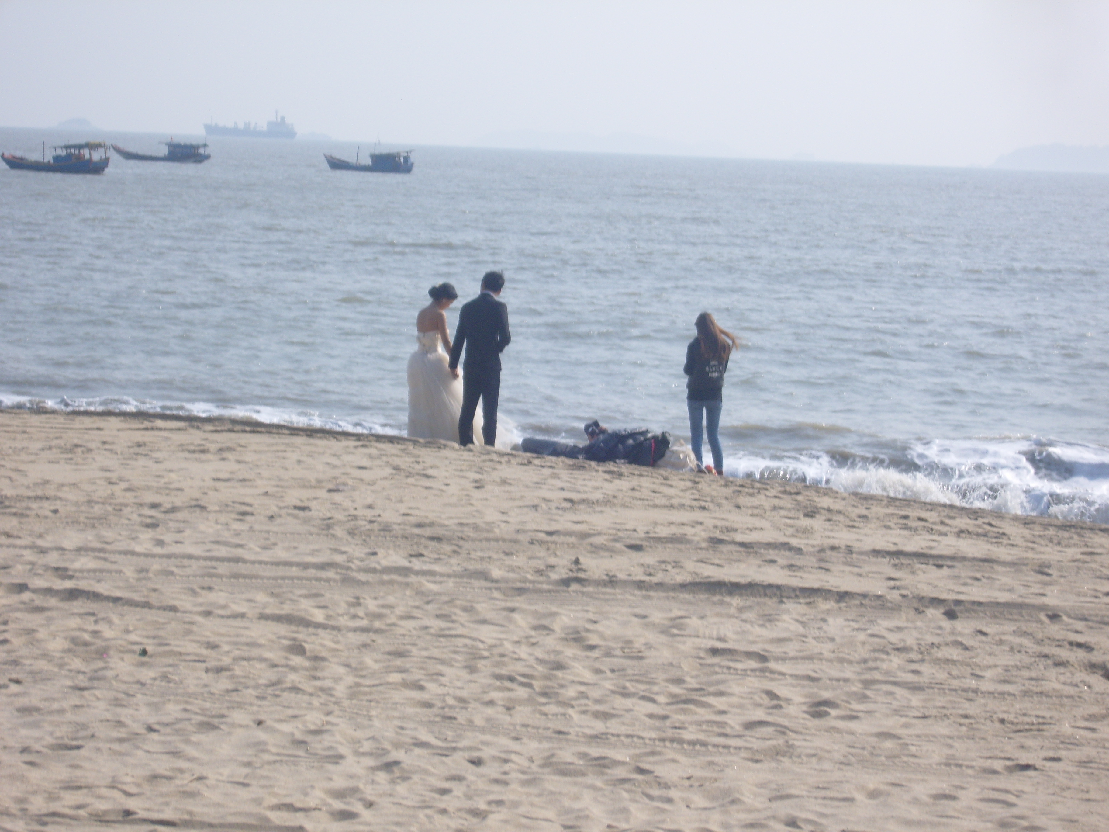 Interesting things along the beach: various stone ornaments, piles of sand (about to replace sand which had been lost to the sea, and which were very attractive to local children), the inevitable groups taking wedding photographs, and the main road, which reminded me very much of the Costa del Sol.