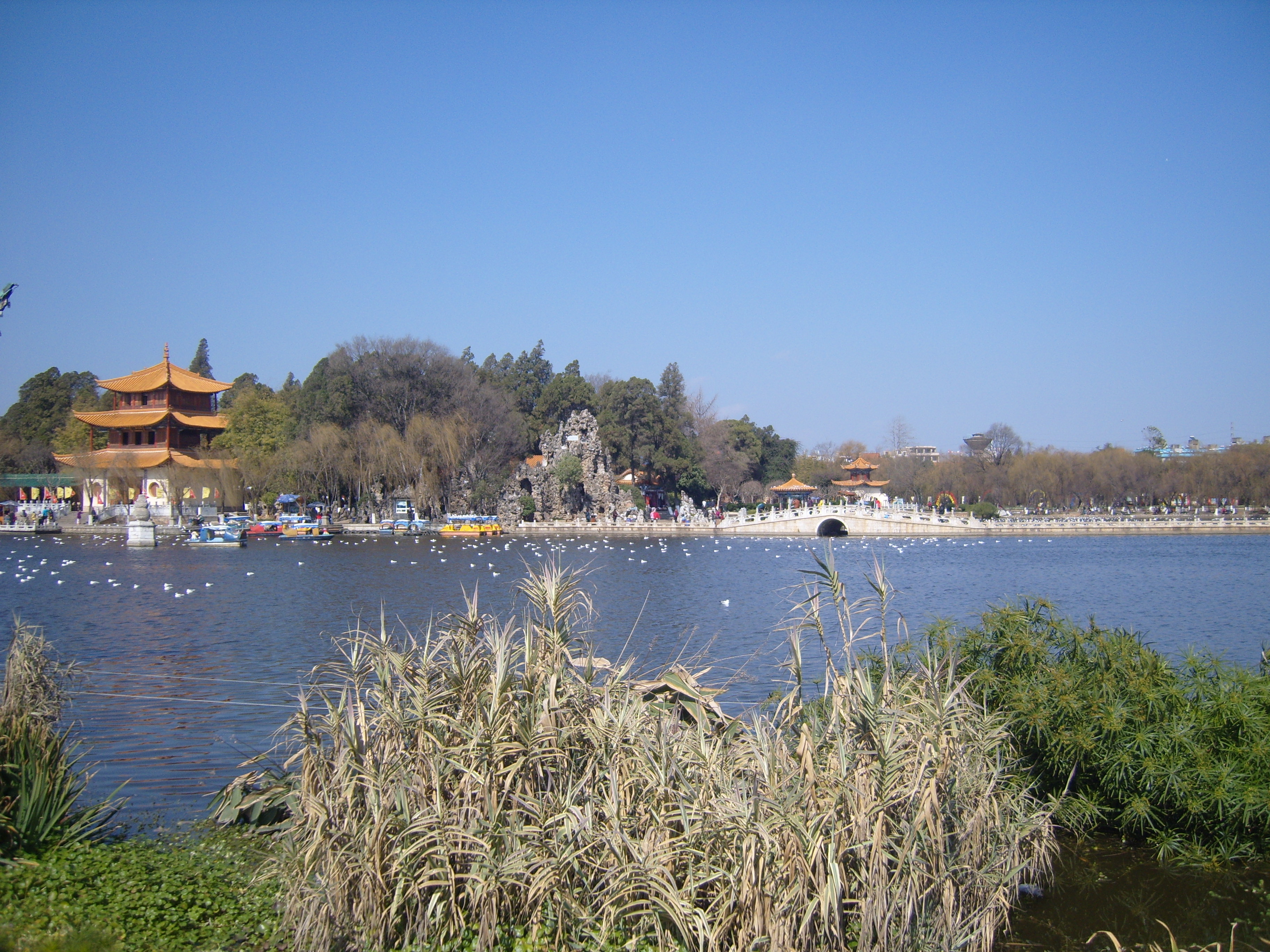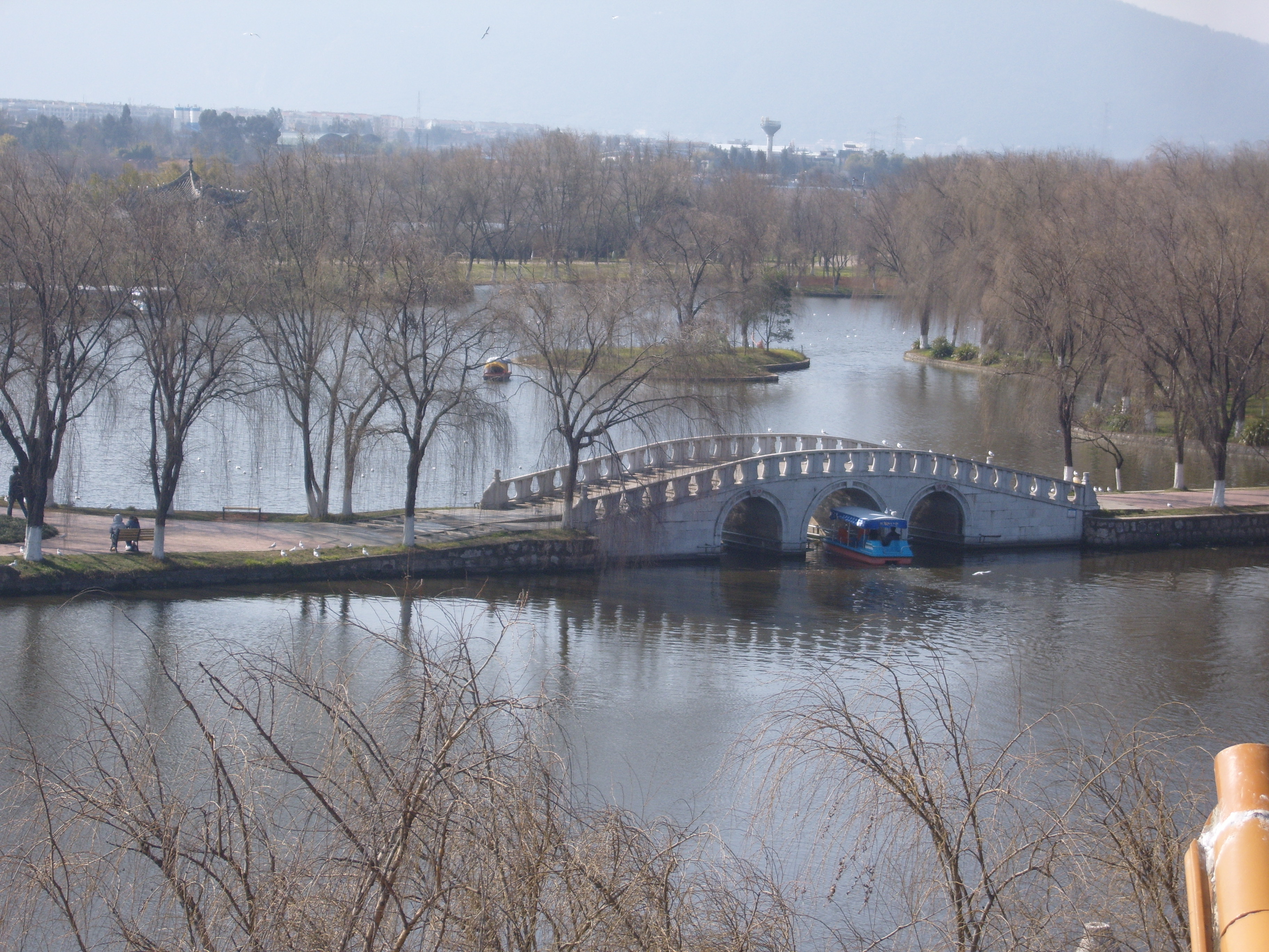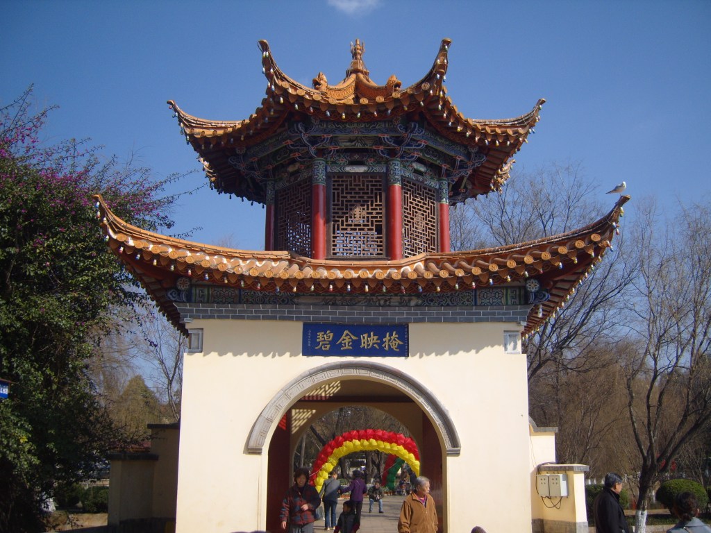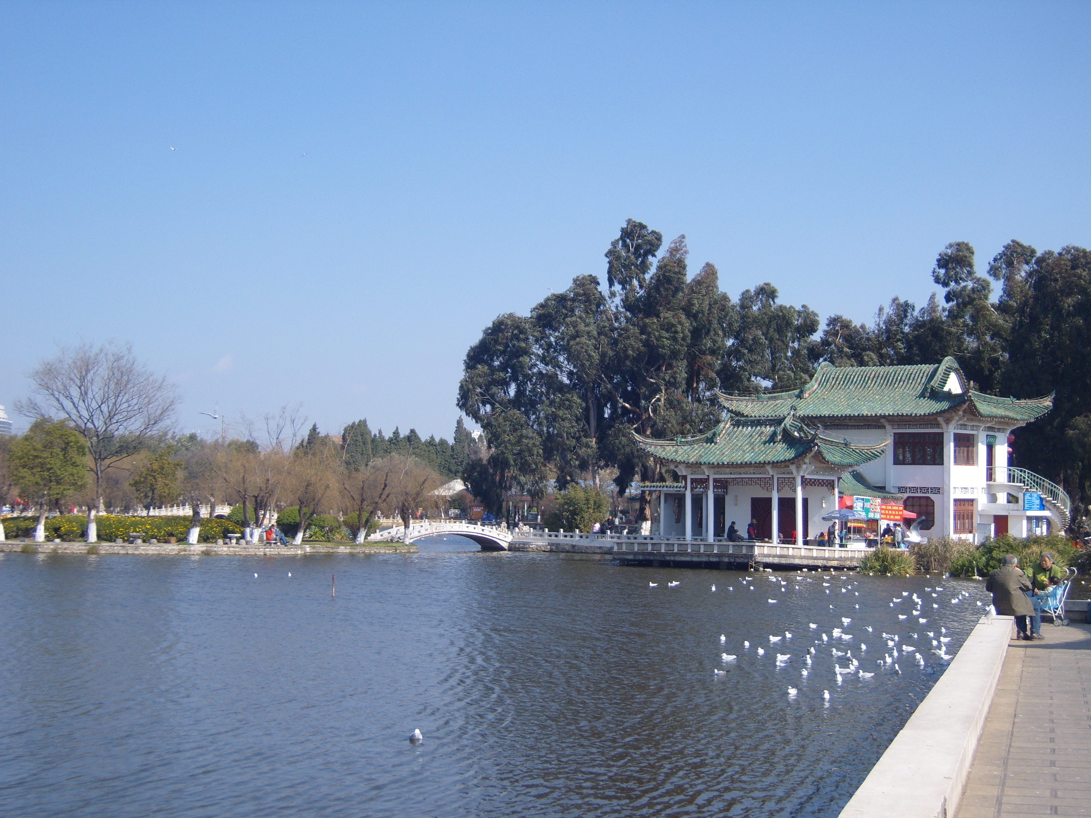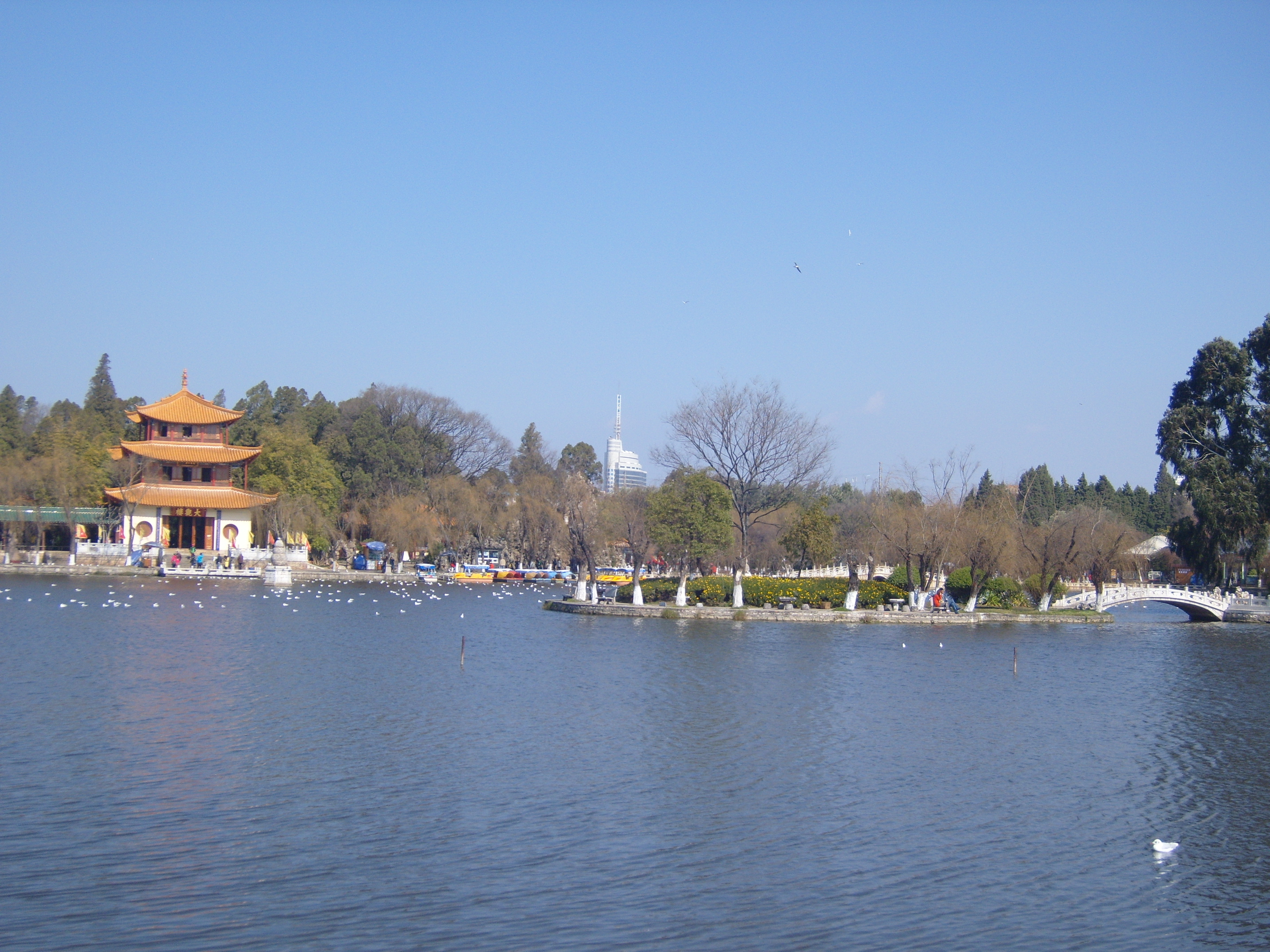 On my second day in Kunming I took a bus southwest across town (it took ages) to an open space marked on the map, because it was an open space marked on the map, so not totally built-up, like everywhere else on the map. This turned out to be a very good idea, and I spent a few hours in winter sunshine enjoying what the locals enjoyed in the winter sunshine: 大观公园; (in traditional Chinese 大觀公園) Dàguān Gōngyuán – Daguan means “Grand View”.