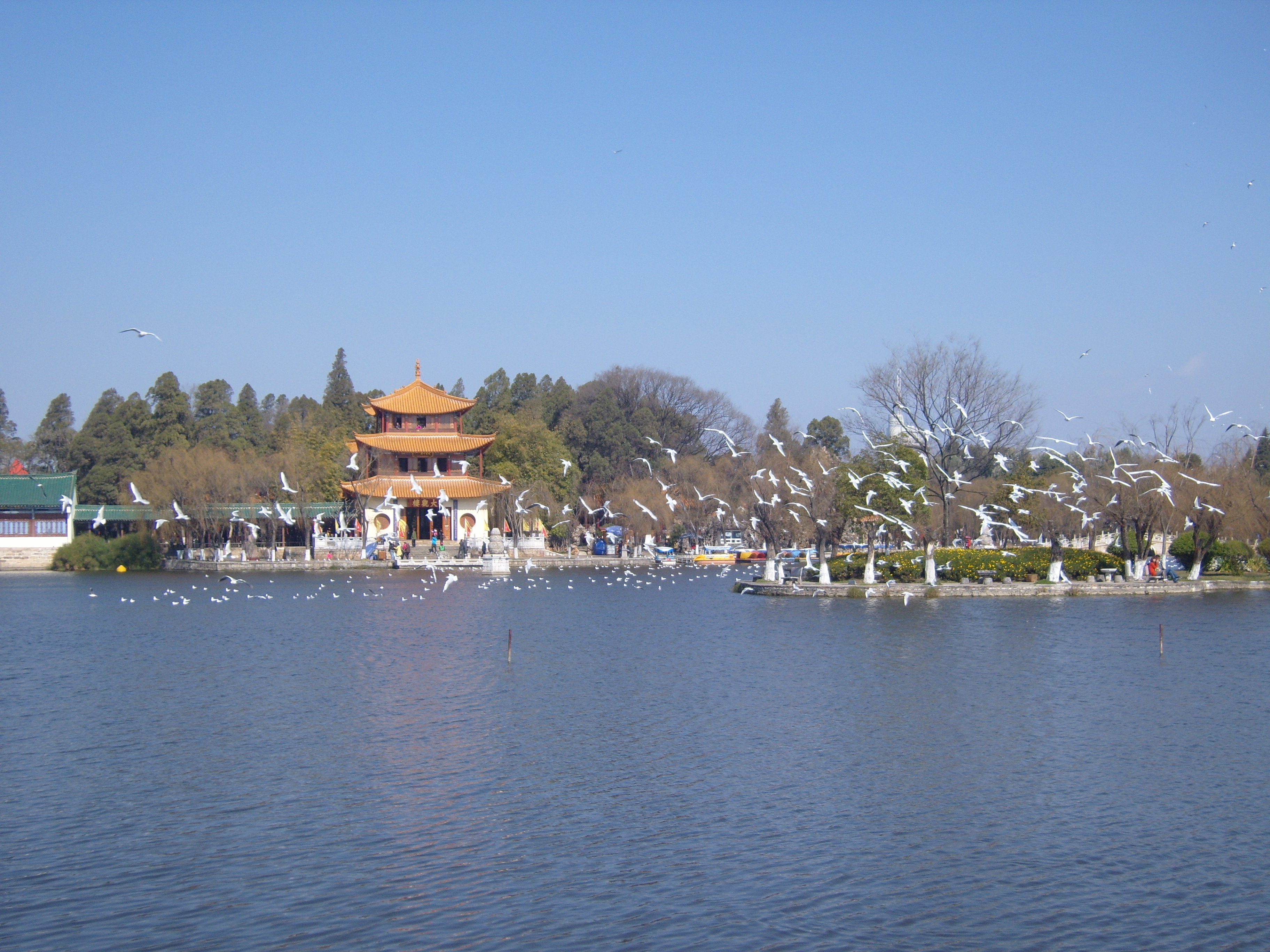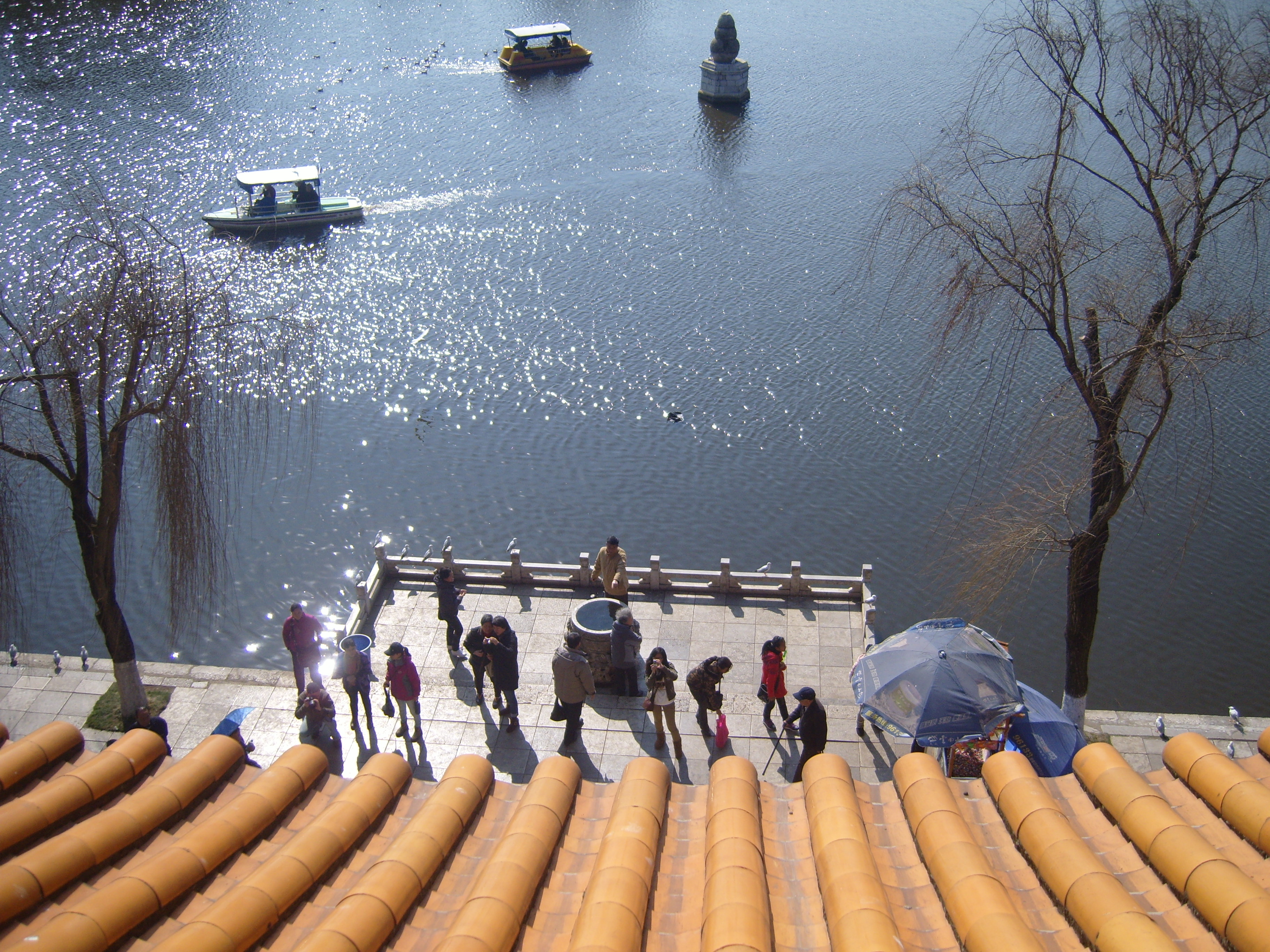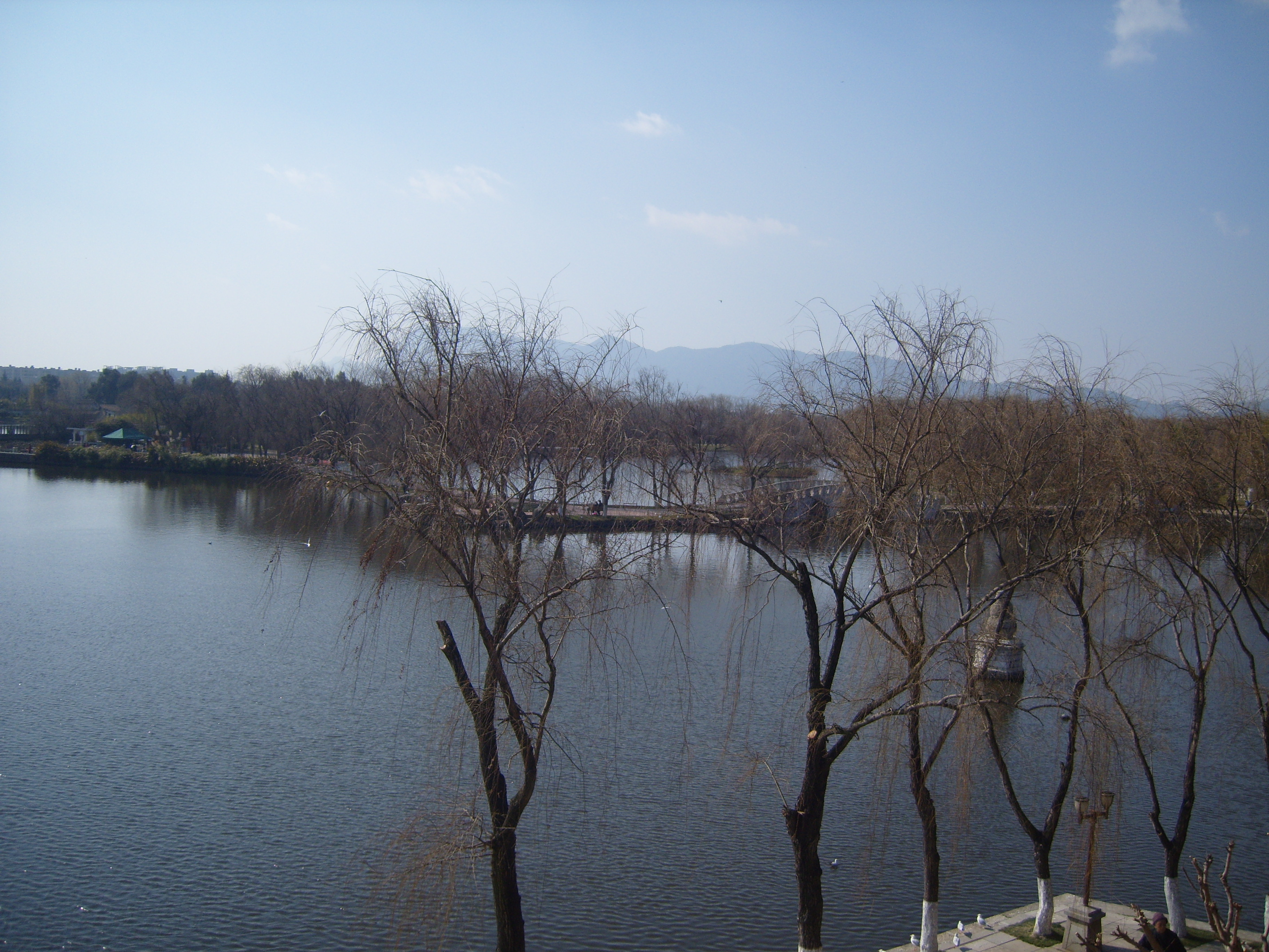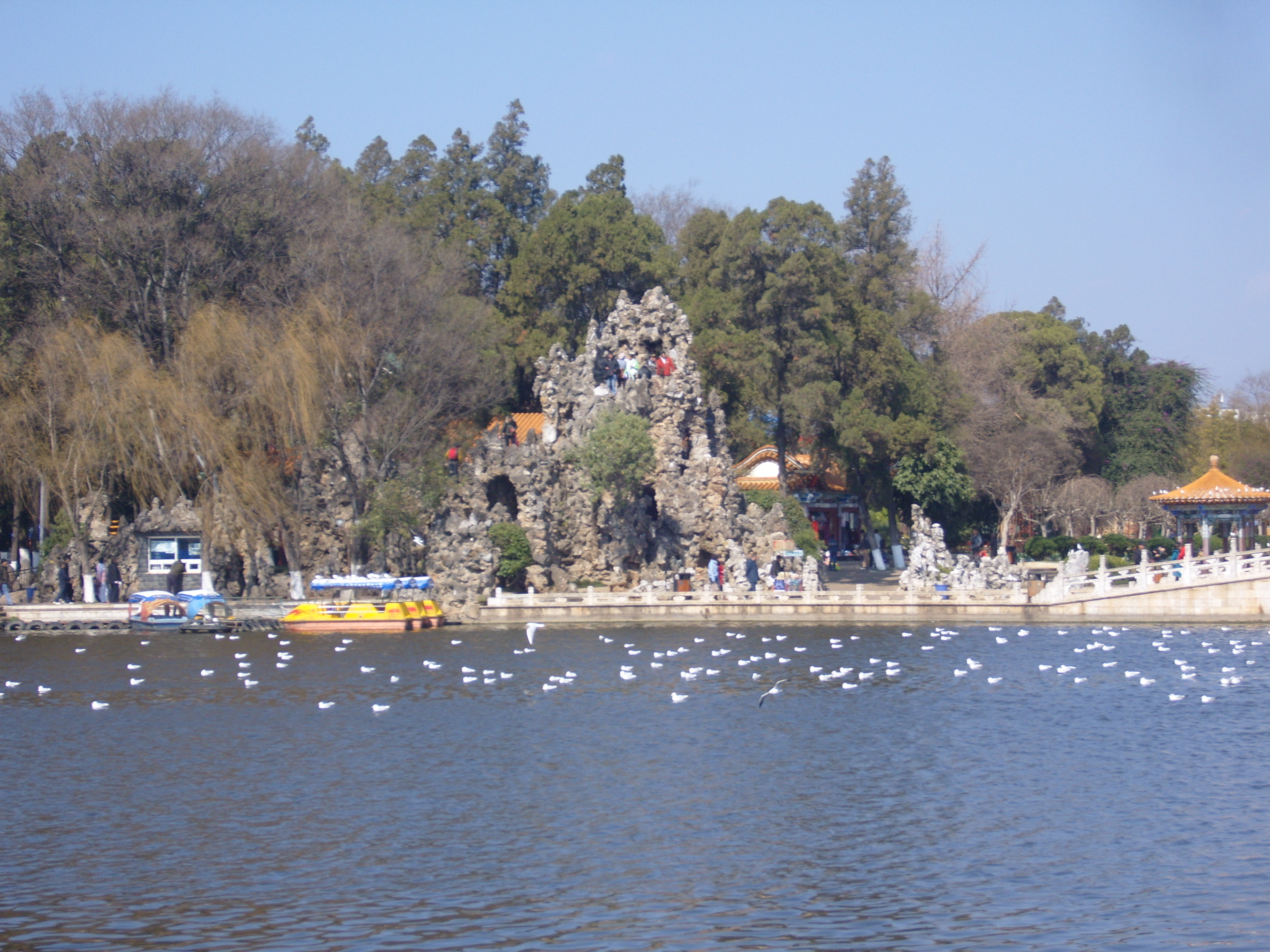 On my second day in Kunming I took a bus southwest across town (it took ages) to an open space marked on the map, because it was an open space marked on the map, so not totally built-up, like everywhere else on the map. This turned out to be a very good idea, and I spent a few hours in winter sunshine enjoying what the locals enjoyed in the winter sunshine: 大观公园; (in traditional Chinese 大觀公園) Dàguān Gōngyuán – Daguan means “Grand View”.